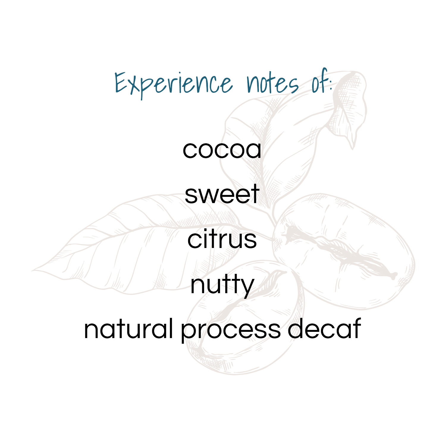 Our decaf coffee is naturally processed through a Sugarcane EA process (a naturally derived compound that extracts caffeine). Ethyl acetate (EA) is an organic compound found in sugarcane, and the decaffeination process begins with the fermentation of molasses derived from sugarcane to create ethanol. This alcohol is then mixed with acetic acid (the main component of vinegar) to create the compound ethyl acetate.